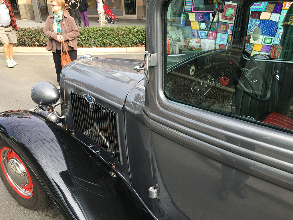 Early Sunday we parked our cars for the main street auto display and, after a simple breakfast, wandered among the various makes and models for some ooh-ahhing and pontification. There were vintage motorcycles, Model Ts, MGs V8s, Americana and Italian supercars. Yve and partner Chris had two great cars on show – her lovely red Cobra and his very fast-looking Lola track car.
